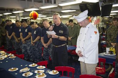 | Keywords: Makin Island Celebrates Thanksgiving 161124-N-FP535-043.jpg en 161124-N-FP535-043 INDIAN OCEAN Nov 24 2016 USS Makin Island LHD 8 Commanding Officer Capt Mark Melson right and Sailors and Marines aboard the amphibious assault ship bow their heads as Makin Island Chaplain Cmdr Thomas Ianucci delivers a prayer before Thanksgiving Day dinner on the ship ™s mess decks Makin Island the flagship of the Makin Island Amphibious Ready Group with the embarked 11th Marine Expeditionary Unit celebrated Thanksgiving while underway in the U S 7th Fleet area of operations in support of security and stability in the Indo-Asia-Pacific region U S Navy photo by Lt David Gardner/Released Unit Navy Media Content Services DVIDS Tags Makin Island; Thanksgiving; NMCS; DVIDS Bulk Import 2016-11-24 Lt David Gardner https //www dvidshub net/image/3016592/makin-island-celebrates-thanksgiving 161124-N-FP535-043 2016-11-29 00 14 PD-USGov-Military-Navy USS Makin Island LHD-8 11th Marine Expeditionary Unit Images from DoD uploaded by Fæ |