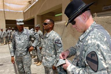 Keywords: Making the grade DVIDS55292.jpg en Lt Col Charles Dalcourt left a Baton Rouge La native and the deputy brigade commander of the 1st Air Cavalry Brigade 1st Cavalry Division looks on as the newly promoted Kingsland Jamaica native Sgt Major Ricardo Burke center the senior non-commissioned officer for Headquarters and Headquarters Company 1st ACB 1st Cav Div waits for the final touch to be added to his promotion ceremony Sept 1 at Camp Taji Iraq Col Dan Shanahan right a native of Traverse City Mich and commander of the 1st ACB pins on the new rank on Burke's headgear making his transformation to one of the most respected ranks in the Non-commissioned Officer Corps a reality 2007-09-01 Staff Sgt Nathan Hoskins https //www dvidshub net/image/55292 55292 2007-09-05 09 01 TAJI IQ PD-USGov 1st Cavalry Division United States Camp Taji Images from DoD uploaded by Fæ