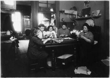 | Keywords: Making neckties in the kitchen. The 11 year old girl and 13 year old boy work on the ties every day after school. The... - NARA - 523523.jpg Scope and content General notes 523523 Local identifier 102-LH-2877 Department of Commerce and Labor Children's Bureau 1912 - 1913 NARA-Author Hine Lewis Wickes 1874-1940 Photographer 1122914 <br /> Still Picture Records Section Special Media Archives Services Division NWCS-S National Archives at College Park 8601 Adelphi Road College Park MD 20740-6001 1912-02-23 Record group Record Group 102 Records of the Children's Bureau 1908 - 2003 Record group ARC 431 National Child Labor Committee Photographs taken by Lewis Hine compiled ca 1912 - ca 1912 documenting the period 1908 - 1912 Series ARC 523064 File unit File unit ARC Variant control numbers NAIL Control Number NWDNS-102-LH-2877 Other versions <gallery> File Making_neckties_in_the_kitchen _The_11_year_old_girl_and_13_year_old_boy_work_on_the_ties_every_day_after_school _The _-_NARA_-_523523 tif tif File Making_neckties_in_the_kitchen _The_11_year_old_girl_and_13_year_old_boy_work_on_the_ties_every_day_after_school _The _-_NARA_-_523523 jpg jpg </gallery> NARA-cooperation PD-USGov Child labor in the United States 13-year-old human males 11-year-old human females |