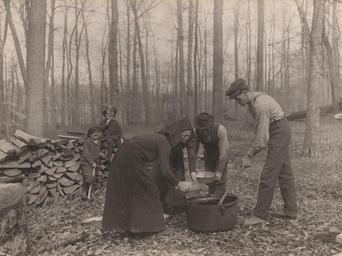 | Keywords: children maple syrup industry maplesyrupindustry monochrome outdoor Photographer: Reuben R. Sallows (1855 - 1937) Description: Two boys observe two women and two men working over a large sugaring kettle; women dressed in dark clothing and wearing bonnets; man in centre wears hat, shirt, dark vest and pants; man standing on right holds long ladle, wears cap, striped shirt, pants and suspenders; one boy, resting foot on axe stands in front of wood pile on right; smaller boy wearing hat sits on top of wood pile; bare trees in background; title and date (1907/25) in pencil and Sallows stamp in blue ink on back Object ID : 0367-rrs-ogohc-ph View additional photographs by Sallows that are held in other collections at the Reuben R. Sallows Digital Library. Order a higher-quality version of this item by contacting the Huron County Museum (fee applies). Photographer: Reuben R. Sallows (1855 - 1937) Description: Two boys observe two women and two men working over a large sugaring kettle; women dressed in dark clothing and wearing bonnets; man in centre wears hat, shirt, dark vest and pants; man standing on right holds long ladle, wears cap, striped shirt, pants and suspenders; one boy, resting foot on axe stands in front of wood pile on right; smaller boy wearing hat sits on top of wood pile; bare trees in background; title and date (1907/25) in pencil and Sallows stamp in blue ink on back Object ID : 0367-rrs-ogohc-ph View additional photographs by Sallows that are held in other collections at the Reuben R. Sallows Digital Library. Order a higher-quality version of this item by contacting the Huron County Museum (fee applies). |