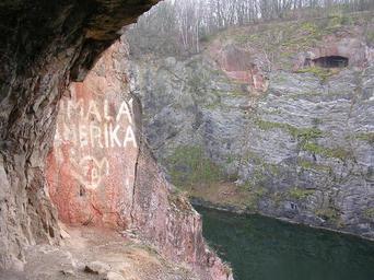 Keywords: Malá Amerika, z Galerie k východu, nápis.jpg Lomy Amerika pohled z Hlavní štoly Galerie k východnímu konci lomu 2007 own Speleman Malá Amerika Hlavní štola Lomy Mořina