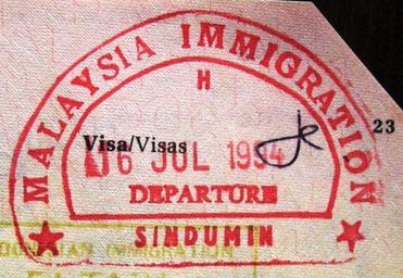 Keywords: Malaysia sindumin exit.JPG en A 1994 passport stamp for exiting Sabah from the Sabah-Sarawak crossing checkpoint at Sindumin Sabah own Slleong 2009-12-26 Passport stamps of Malaysia