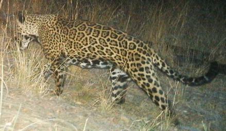 | Keywords: animal carnivore jaguar outdoor [UA Jaguar 2014 05-02 #64 aa] Male jaguar photographed by automatic wildlife cameras in the Santa Rita Mountains on May 2, 2014, as part of a U.S. Fish and Wildlife Service/Department of Homeland Security-funded jaguar survey conducted by University of Arizona. This is the same jaguar that has been repeatedly photographed in the Santa Rita Mountains. Photo Courtesy of UA/USFWS [UA Jaguar 2014 05-02 #64 aa] Male jaguar photographed by automatic wildlife cameras in the Santa Rita Mountains on May 2, 2014, as part of a U.S. Fish and Wildlife Service/Department of Homeland Security-funded jaguar survey conducted by University of Arizona. This is the same jaguar that has been repeatedly photographed in the Santa Rita Mountains. Photo Courtesy of UA/USFWS |