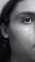 Keywords: male man face blue eye dreamy dark hair black and white portrait human