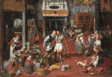 | Keywords: Måleri, genrebild. Köksinteriör - Skoklosters slott - 88962.tif Män kvinnor och djur köksredskap I bakgrundens mitt öppen spis till höger skåp <br/>På baksidan målat 34 två gånger 4 cm högt Lapp på baksidan Ett Köks-stycke flere personer sysselsatte med åtskielliege göromål samt flere Stil-leben i ett annat rum bordsällskap målad på träd af R Londius 33 tum hög - 48 tum bred Lappens storlek 10 x 16 cm <br/><br/>Kitchen interior <br/>This painting shows an interior view of a larger kitchen with various figures occupied in different tasks At the center of the composition are two men the one on the right is about to cut up a rabbit while the other holds a plate possibly for assistance In the left corner of the foreground is a woman stirring a pot and to the left sits a woman nurcering a child Behind them is a smaller brawl as one man grabs a woman who is doing the dishes to the clear annoyment of her fellow dishwashing colleague In the background in the upper left corner sits a party of people eating by a table This painting shows a similarity to the characters in Cake Scene by van Cleve at the Museo di Castelvecchio in Verona original caption Måleri genrebild Köksinteriör <br/> Nyckelord Köksinredning Interiör Matlagning Djur Möbler Målning Golv Köksredskap ca 1565 oil on canvas size mm 1160 805 SKO Barn i ett gammalt slott - stormakt skatter spöken 1997 Skoklosters slott Dukning för Slottskollo tema mat och dukning 2009-2012 Skoklosters slott place of origin original filename sm_dig3533 24929 inventory number SKO 3635 88962 PD Jens Mohr Jens Mohr Paintings of kitchens 1565 People in kitchens in art 1565 Cooking in art Kitchen furniture 1565 1565 paintings Marten van Cleve 1565 Media contributed by LSH unmatched objKeyword Media contributed by LSH unmatched creator Media contributed by LSH unmatched keyword Media contributed by LSH 2013-10 |