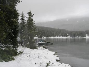 Keywords: boat winter snow Jasper National Park Alberta Canada Maligne Lake dock landscape
