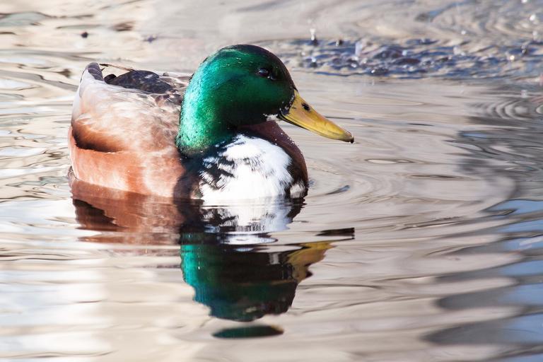 Keywords: mallard anas platyrhynchos drake bill yellow duck bird animal water swim lake mirroring
