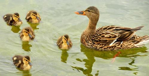 Keywords: mallard ducks hen brood waterfowl wildlife nature family mother babies swimming paddling ducklings