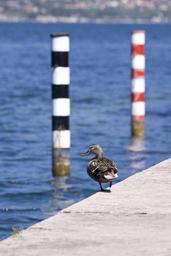 Keywords: mallard female bird ducks swimming duck bank promenade lake pier piles dolphin holzdalben black white red striped