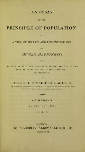 Keywords: Malthus - Essay on the principle of population, 1826 - 5884843.tif Book Malthus Thomas Robert Essay on the principle of population John Murray Albemarle street London eng it An essay on the principle of population; or A view of its past and present effects on human happiness; with inquiry into our prospects respecting the future removal or mitigation of the evils which it occasions By T R Malthus ¦ 1 - London John Murray Albemarle street 1826 London printed C Roworth Bell Yard Temple Bar - XVIII 535 1 p ; 4° - Segn A-2L4 2M4 BEIC 5884843 Institution BEIC PD-old-100-1923 Economics by decade Thomas Malthus Economics book covers |