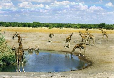 Keywords: mammal wild animal africa namibia savannah water hole potions watering hole desert giraffa camelopardalis nature reticulated giraffe