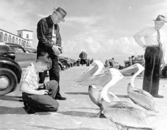 Keywords: florida pelicans camera photographers birds st. petersburg stpetersburg 1948 cameras peter c. magheese petercmagheese david small davidsmall e. tawas, michigan etawasmichigan pelecanidae pinellas county pinellascounty blackandwhite state library and archives of florida statelibraryandarchivesofflorida million dollar pier milliondollarpier monochrome black and white Local call number: c009072 Title: [Man and boy photographing pelicans: Saint Petersburg, Florida] Date: Photographed on January 27, 1948. Physical descrip: 1 photoprint b&w 4 x 5 in. Series Title: (Commerce Collection.) General note: The man standing is Peter C. Magheese of Grand Rapids, Michigan, and the young boy (age 10) is David Small from E. Tawas, Michigan. Repository: State Library and Archives of Florida, 500 S. Bronough St., Tallahassee, FL 32399-0250 USA. Contact: 850-245-6700. Archives@dos.state.fl.us Persistent URL: www.floridamemory.com/items/show/68218 Local call number: c009072 Title: [Man and boy photographing pelicans: Saint Petersburg, Florida] Date: Photographed on January 27, 1948. Physical descrip: 1 photoprint b&w 4 x 5 in. Series Title: (Commerce Collection.) General note: The man standing is Peter C. Magheese of Grand Rapids, Michigan, and the young boy (age 10) is David Small from E. Tawas, Michigan. Repository: State Library and Archives of Florida, 500 S. Bronough St., Tallahassee, FL 32399-0250 USA. Contact: 850-245-6700. Archives@dos.state.fl.us Persistent URL: www.floridamemory.com/items/show/68218