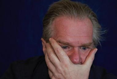 Keywords: man face portrait head eyes hand think thinking mouth receding hairline closeup human male person view blue direction self portrait