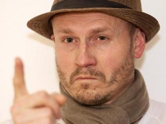 Keywords: man hat finger high warning admonitory male portrait