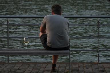 Keywords: man holiday water tourist sit abendstimmung rest shorts human sunset break romantic wine glass wine idyllic romance enjoy atmosphere bank out bench click wooden bench close motif relax beautiful