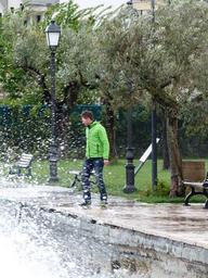 Keywords: man human person wet spray inject water garda promenade flooded
