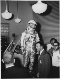| Keywords: Man in Space Suit - NARA - 278192.tif Scope and content This is a photograph of a man wearing one of the space suits designed for the Mercury-Atlas 6 flight General notes 278192 Local identifier National Aeronautics and Space Administration 10/01/1958 - NARA's Southwest Region Fort Worth NRFA 1400 John Burgess Drive Fort Worth TX 76140 Record group Record Group 255 Records of the National Aeronautics and Space Administration 1903 - 2006 Record group ARC 582 Source Files on Project Mercury compiled 1952 - 1968 Series ARC 278158 File unit Photographs -- Mercury Atlas 6 MA-6 File unit ARC 278191 Variant control numbers NAIL Control Number NRFF-255-70-37 4 -SS1 yes Other versions NARA-cooperation PD-USGov Black and white photographs Black and white photographs of standing men Black and white photographs of the United States in the 1960s Gus Grissom Men facing right and looking right Men with glasses Mercury-Atlas 6 Mercury Spacesuit People of the United States in the 1960s |