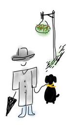 Keywords: man old man dog umbrella hat street flower flower pot hanging flower company accompany elderly jacket gray companion pet black dog time walking rainy sketch doodle