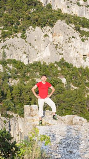 Keywords: man person courageous self-conscious wanderer hike abyss detached ruin of philippe de cabassolle castle burgruine ruin fontaine-de-vaucluse france provence castle of philippe de cabassolle rock gorge shirt t shirt red happy goal achieved