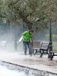 Keywords: man person get wet inject downpour soaked wave wet lake spray water garda promenade flooded taken flood