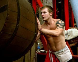 Keywords: man renaissance fair vendor barrel shirtless tattoo