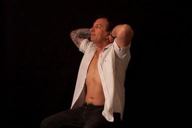 Keywords: man shirt tattoo sitting portrait