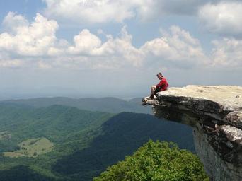 Keywords: man sitting rock knob hiking mountain