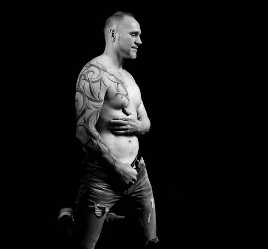 Keywords: man sitting tattoo black and white portrait only boy sensual