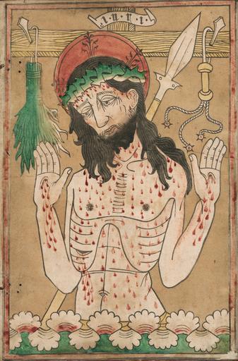 | Keywords: Man of Sorrows - Google Art Project.jpg 15th century 1967591 German 15th century /collection/the-art-institute-of-chicago/artwork/man-of-sorrows-unknown-artist/615032/ 105719 Unknown artist creator /artist/unknown/4128544/ 4128544 /collection/the-art-institute-of-chicago/ The Art Institute of Chicago 356038 http //www artic edu/aic/ 12/30/2011 9 08 13 PM /collection/the-art-institute-of-chicago/artwork/man-of-sorrows-unknown-artist/615032/ 1465 c 1465/70 Woodcut hand-colored with brush and watercolor on cream laid paper edge-mounted to vellum laid down on wooden book cover covered in hand-tooled leather with tooled metal hinges 397 615032 True 1470 image; 405 x 269 mm sheet 3/24/2012 8 03 57 AM 1947 731 http //www artic edu/aic/collections/artwork/105719 http //www artic edu/aic/copyright html The Art Institute of Chicago Waller Fund; gifts of Mrs Tiffany Blake Thomas E Donnelley Emil Eitel Carolyn Morse Ely Alfred E Hamill Frank B Hubachek Monarch Leather and Mrs Potter Palmer Print 1460 1480 nation Germany Europe object made in w262 x h397 mm c 1465/70 False 0 658203125 object man-of-sorrows-unknown-artist Man of Sorrows m 262 Woodcut hand-colored with brush and watercolor on cream laid paper edge-mounted to vellum laid down on wooden book cover covered in hand-tooled leather with tooled metal hinges special url_id 9AEVVvAzOjXWyA PD-old-100 Google Art Project works by unknown artist Woodcuts of Germany Engravings of the Man of Sorrows Colored Prints 15th-century woodcuts Arma Christi |