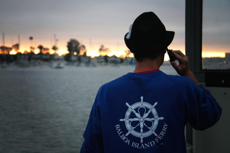 Keywords: man telephoning making phone call balboa newport scenic landmark twilight dusk sunset ferry harbor harbour transportation bay california hat peninsula crossing ocean pacific fun zone