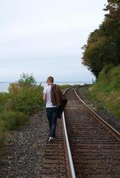 Keywords: man train people railway male journey railroad jacket walking distant trees water rocks metal