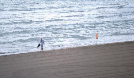 Keywords: man beach coast along shore white sand adult holiday male summer one walk person sea water silhouette nature vacation