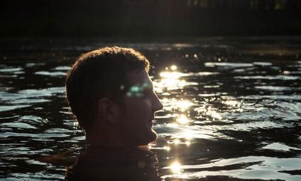 Keywords: man water sun summer vacation evening sunset the glare lake youth nature light silence ripple in the water