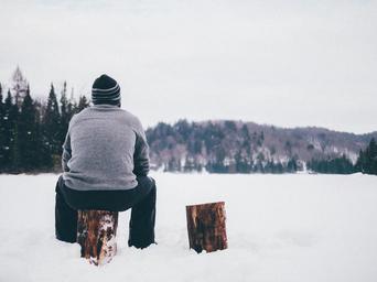 Keywords: man winter snow sitting wood wood log male adult person cold outdoors season thinking pine trees