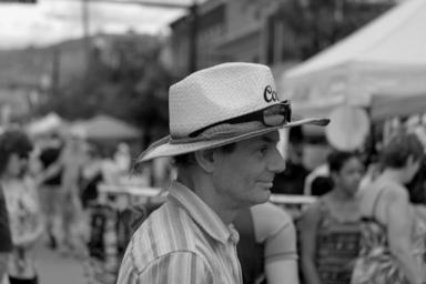 Keywords: blackandwhite black white bw monochrome street streetphotography downtown canada britishcolumbia bc okanagan kelowna man male person summer blockparty hat