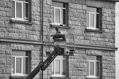 Keywords: man work nacelle glass city urban facade house facade wall black and white worker character