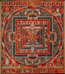 | Keywords: Mandala of the Forms of Manjushri, the Bodhisattva of Transcendent Wisdom.jpg Mandala of the Forms of Manjushri the Bodhisattva of Transcendent Wisdom Tibet At center sits Manjushri the peaceful form of Manjuvajra a bodhisattva who cuts through ignorance He is golden has three faces and embraces his consort Prajna ”iconography as prescribed in the Vajrayana text the Nishpanna Yogavali Garland of Perfection Yoga In the four directions are towers with floral motifs spewing from the mouths of makaras that together take the form of crossed vajras denoting the stable axis upon which Manjushri sits Rings of lotus petals vajras and fire mark the sacred space of the central palace In the corners are images of Manjushri Below are Taras and ferocious protectors including Mahakala and Palden Lhamo as well as a monk who performs the consecration ritual for the mandala The figural style and ornamental rendering suggest that a Nepalese artist painted this work for a Tibetan patron Distemper on cloth 33 1/16 x 29 1/8 in 83 9 x 74 cm http //www metmuseum org/collection/the-collection-online/search/37804 late 14th century unknown PD-old-100 Mandala thangka from Tibet Tibetan Buddhist paintings in the Metropolitan Museum of Art 14th-century paintings from Tibet Files uploaded by Yann Forget Manjusri |
