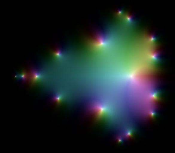 Keywords: Mandelbrot-Iterate-05.jpg The diagram shows the part of the complex plane ranging from “2 2 to 1 on the real axis horizontal and from “1 4i to 1 4i on the imaginary axis vertical The color for a point <math>c</math> in the plane is the color coded value of the function <math>f \ n _c 0 \quad\text for n 5\quad\text and f_c z z 2+c</math> Note that the exponent refers to <math>f</math> as a function and not to its value i e <math>f</math> <math> n</math> denotes n-fold applying <math>f</math> <math>f \ n f\circ f\circ \cdots \circ f</math> So <math>f</math> <math> n</math> is an element of the sequence <math>\begin align f_c \ 0 \ \; z \mapsto z\\ f_c \ 1 \ \; z \mapsto z 2+c\\ f_c \ 2 \ \; z \mapsto z 2+c 2+c\\ f_c \ 3 \ \; z \mapsto z 2+c 2+c 2+c\\ \;\;\vdots \end align </math> For <math>n>0</math> the function <math>f_c n 0 </math> is a polynomial of degree <math>2 n-1 </math> in <math>c</math> Therefore it has <math>2 n-1 </math> zeros in the complex plane It turns out that all zeros are distinct Moreover the zeros are located in a disc around the origin whose diamater does not depend on <math>n</math> Das Diagramm zeigt einen Teil der komplexen Zahlen mit Realteil zwischen “2 2 to 1 horizontal und Imaginärteil zwischen “1 4i und 1 4i vertikal Die Farbe eines Punktes <math>c</math> der Ebene ist der farbcodierte Wert der Funktion <math>f \ n _c 0 \quad\text mit n 5\quad\text und f_c z z 2+c</math> Hierbei bezieht sich der Exponent auf <math>f</math> als Funktion und nicht auf deren Funktionswert d h <math>f</math> <math> n</math> steht fĂĽr die n-fache HintereinanderausfĂĽhrung von <math>f</math> <math>f \ n f\circ f\circ \cdots \circ f</math> Es ist <math>f</math> <math> n</math> also ein Glied der Folge <math>\begin align f_c \ 0 \ \; z \mapsto z\\ f_c \ 1 \ \; z \mapsto z 2+c\\ f_c \ 2 \ \; z \mapsto z 2+c 2+c\\ f_c \ 3 \ \; z \mapsto z 2+c 2+c 2+c\\ \;\;\vdots \end align </math> FĂĽr <math>n>0</math> ist die Funktion <math>f_c n 0 </math> ein Polynom vom Grade <math>2 n-1 </math> in <math>c</math> Somit hat die Funktion <math>2 n-1 </math> Nullstellen die alle verschieden sind Zudem liegen alle Nullstellen in einem Kreis dessen Größe unabhängig von <math>n</math> ist Self made using a throw-away C program 2008-03-24 Georg-Johann Lay Images of the sequence for n 1 20 0 cellpadding 1 cellspacing 1 - 110px thumb left 1 color map 110px thumb left 2 110px thumb left 3 110px thumb left 4 110px thumb left 5 - 110px thumb left 6 110px thumb left 7 110px thumb left 8 110px thumb left 9 110px thumb left 10 - 110px thumb left 11 110px thumb left 12 110px thumb left 13 110px thumb left 14 110px thumb left 15 - 110px thumb left 16 110px thumb left 17 110px thumb left 18 110px thumb left 19 110px thumb left 20 From step to step the number of zeros white is doubling The zeros are chaotically scattered around in a disc whose diameter does not depend on <math>n</math> For values of <math>c</math> that belong the the Mandelbrot set <math>M</math> the sequence <math>f 1_c 0 \; f 2_c 0 \; f 3_c 0 \ \ldots </math> is bounded For values not in <math>M</math> the sequence tends to infinity black Values of <math>c</math> located in the body of <math>M</math> ” the big cardioid ” lead to sequences that converge to a definite complex number In other words these values converge to a cycle of period 1 Values in the head of <math>M</math> ” the big circle at the left of the body ” tend to periodoc cycles of period 2 This can be seen in the sequence of images because the head changes its color from bright to dark and vice versa from step to step Values located in the small bulbs ” the hands symetrically arranged to the body ” tend to periodic cycles of period 3 and so on Von Schritt zu Schritt verdoppelt sich die Anzahl der Nullstellen weiĂź Die Nullstellen sind chaotisch verstreut in einem begrenzten Gebiet dessen Größe nicht von <math>n</math> abhängt FĂĽr Werte <math>c</math> in der Mandelbrot-Mengem <math>M</math> sind die Folgen <math>f 1_c 0 \; f 2_c 0 \; f 3_c 0 \ \ldots </math> beschränkt FĂĽr Werte ausserhalb von <math>M</math> streben die Folgen gegen Unendlich schwarz Werte im Körper von<math>M</math> ” dem Zykloid ” fĂĽhren zu konvergenten Folgen Mit anderen Worten die zugehörigen Folgewerte konvergieren gegen periodische Zykel der Länge 1 Werte im Kopf von <math>M</math> ” dem groĂźen Kreis links am Körper ” streben gegen periodische Zykel der Länge 2 Dies sieht man daran daĂź der Kopf mit jeden Bild seine Farbe von hell nach dunkel wechselt Werte in den Ă„rmchen ” den grösseren Kreisen links und rechts des Körpers ” fĂĽhren zu Folgen deren Grenzzyklen Periode 3 hat usw Coloring complex numbers To color a complex value the function described in <ref>Visualising complex functions</ref> is used with the parameters <math>\begin align a_s 0 6 \ b_s 0 5 \\ a_v 0 4 \ b_v 0 3 \\ \end align </math> and with S and V interchanged Zeros turn to white and infinity to black Zum Färben komplexer Zahlen verwende ich die Methode wie beschrieben in<sup>1</sup> mit den Parametern <math>\begin align a_s 0 6 \ b_s 0 5 \\ a_v 0 4 \ b_v 0 3 \\ \end align </math> und mit vertauschten Rollen von S und V Die Null wird zu WeiĂź und Unendlich zu Schwarz References <references/> Complex color plots of Mandelbrot iterations Order 5 |