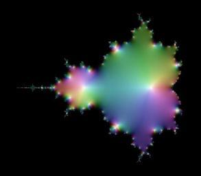 | Keywords: Mandelbrot-Iterate-10.jpg The diagram shows the part of the complex plane ranging from “2 2 to 1 on the real axis horizontal and from “1 4i to 1 4i on the imaginary axis vertical The color for a point <math>c</math> in the plane is the color coded value of the function <math>f \ n _c 0 \quad\text for n 10\quad\text and f_c z z 2+c</math> Note that the exponent refers to <math>f</math> as a function and not to its value i e <math>f</math> <math> n</math> denotes n-fold applying <math>f</math> <math>f \ n f\circ f\circ \cdots \circ f</math> So <math>f</math> <math> n</math> is an element of the sequence <math>\begin align f_c \ 0 \ \; z \mapsto z\\ f_c \ 1 \ \; z \mapsto z 2+c\\ f_c \ 2 \ \; z \mapsto z 2+c 2+c\\ f_c \ 3 \ \; z \mapsto z 2+c 2+c 2+c\\ \;\;\vdots \end align </math> For <math>n>0</math> the function <math>f_c n 0 </math> is a polynomial of degree <math>2 n-1 </math> in <math>c</math> Therefore it has <math>2 n-1 </math> zeros in the complex plane It turns out that all zeros are distinct Moreover the zeros are located in a disc around the origin whose diamater does not depend on <math>n</math> Das Diagramm zeigt einen Teil der komplexen Zahlen mit Realteil zwischen “2 2 to 1 horizontal und Imaginärteil zwischen “1 4i und 1 4i vertikal Die Farbe eines Punktes <math>c</math> der Ebene ist der farbcodierte Wert der Funktion <math>f \ n _c 0 \quad\text mit n 10\quad\text und f_c z z 2+c</math> Hierbei bezieht sich der Exponent auf <math>f</math> als Funktion und nicht auf deren Funktionswert d h <math>f</math> <math> n</math> steht fĂĽr die n-fache HintereinanderausfĂĽhrung von <math>f</math> <math>f \ n f\circ f\circ \cdots \circ f</math> Es ist <math>f</math> <math> n</math> also ein Glied der Folge <math>\begin align f_c \ 0 \ \; z \mapsto z\\ f_c \ 1 \ \; z \mapsto z 2+c\\ f_c \ 2 \ \; z \mapsto z 2+c 2+c\\ f_c \ 3 \ \; z \mapsto z 2+c 2+c 2+c\\ \;\;\vdots \end align </math> FĂĽr <math>n>0</math> ist die Funktion <math>f_c n 0 </math> ein Polynom vom Grade <math>2 n-1 </math> in <math>c</math> Somit hat die Funktion <math>2 n-1 </math> Nullstellen die alle verschieden sind Zudem liegen alle Nullstellen in einem Kreis dessen Größe unabhängig von <math>n</math> ist Self made using a throw-away C program 2008-03-24 Georg-Johann Lay Images of the sequence for n 1 20 0 cellpadding 1 cellspacing 1 - 110px thumb left 1 color map 110px thumb left 2 110px thumb left 3 110px thumb left 4 110px thumb left 5 - 110px thumb left 6 110px thumb left 7 110px thumb left 8 110px thumb left 9 110px thumb left 10 - 110px thumb left 11 110px thumb left 12 110px thumb left 13 110px thumb left 14 110px thumb left 15 - 110px thumb left 16 110px thumb left 17 110px thumb left 18 110px thumb left 19 110px thumb left 20 From step to step the number of zeros white is doubling The zeros are chaotically scattered around in a disc whose diameter does not depend on <math>n</math> For values of <math>c</math> that belong the the Mandelbrot set <math>M</math> the sequence <math>f 1_c 0 \; f 2_c 0 \; f 3_c 0 \ \ldots </math> is bounded For values not in <math>M</math> the sequence tends to infinity black Values of <math>c</math> located in the body of <math>M</math> ” the big cardioid ” lead to sequences that converge to a definite complex number In other words these values converge to a cycle of period 1 Values in the head of <math>M</math> ” the big circle at the left of the body ” tend to periodoc cycles of period 2 This can be seen in the sequence of images because the head changes its color from bright to dark and vice versa from step to step Values located in the small bulbs ” the hands symetrically arranged to the body ” tend to periodic cycles of period 3 and so on Von Schritt zu Schritt verdoppelt sich die Anzahl der Nullstellen weiĂź Die Nullstellen sind chaotisch verstreut in einem begrenzten Gebiet dessen Größe nicht von <math>n</math> abhängt FĂĽr Werte <math>c</math> in der Mandelbrot-Mengem <math>M</math> sind die Folgen <math>f 1_c 0 \; f 2_c 0 \; f 3_c 0 \ \ldots </math> beschränkt FĂĽr Werte ausserhalb von <math>M</math> streben die Folgen gegen Unendlich schwarz Werte im Körper von<math>M</math> ” dem Zykloid ” fĂĽhren zu konvergenten Folgen Mit anderen Worten die zugehörigen Folgewerte konvergieren gegen periodische Zykel der Länge 1 Werte im Kopf von <math>M</math> ” dem groĂźen Kreis links am Körper ” streben gegen periodische Zykel der Länge 2 Dies sieht man daran daĂź der Kopf mit jeden Bild seine Farbe von hell nach dunkel wechselt Werte in den Ă„rmchen ” den grösseren Kreisen links und rechts des Körpers ” fĂĽhren zu Folgen deren Grenzzyklen Periode 3 hat usw Coloring complex numbers To color a complex value the function described in <ref>Visualising complex functions</ref> is used with the parameters <math>\begin align a_s 0 6 \ b_s 0 5 \\ a_v 0 4 \ b_v 0 3 \\ \end align </math> and with S and V interchanged Zeros turn to white and infinity to black Zum Färben komplexer Zahlen verwende ich die Methode wie beschrieben in<sup>1</sup> mit den Parametern <math>\begin align a_s 0 6 \ b_s 0 5 \\ a_v 0 4 \ b_v 0 3 \\ \end align </math> und mit vertauschten Rollen von S und V Die Null wird zu WeiĂź und Unendlich zu Schwarz References <references/> Complex color plots of Mandelbrot iterations Order 10 |