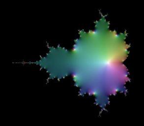 | Keywords: Mandelbrot-Iterate-11.jpg The diagram shows the part of the complex plane ranging from “2 2 to 1 on the real axis horizontal and from “1 4i to 1 4i on the imaginary axis vertical The color for a point <math>c</math> in the plane is the color coded value of the function <math>f \ n _c 0 \quad\text for n 11\quad\text and f_c z z 2+c</math> Note that the exponent refers to <math>f</math> as a function and not to its value i e <math>f</math> <math> n</math> denotes n-fold applying <math>f</math> <math>f \ n f\circ f\circ \cdots \circ f</math> So <math>f</math> <math> n</math> is an element of the sequence <math>\begin align f_c \ 0 \ \; z \mapsto z\\ f_c \ 1 \ \; z \mapsto z 2+c\\ f_c \ 2 \ \; z \mapsto z 2+c 2+c\\ f_c \ 3 \ \; z \mapsto z 2+c 2+c 2+c\\ \;\;\vdots \end align </math> For <math>n>0</math> the function <math>f_c n 0 </math> is a polynomial of degree <math>2 n-1 </math> in <math>c</math> Therefore it has <math>2 n-1 </math> zeros in the complex plane It turns out that all zeros are distinct Moreover the zeros are located in a disc around the origin whose diamater does not depend on <math>n</math> Das Diagramm zeigt einen Teil der komplexen Zahlen mit Realteil zwischen “2 2 to 1 horizontal und Imaginärteil zwischen “1 4i und 1 4i vertikal Die Farbe eines Punktes <math>c</math> der Ebene ist der farbcodierte Wert der Funktion <math>f \ n _c 0 \quad\text mit n 11\quad\text und f_c z z 2+c</math> Hierbei bezieht sich der Exponent auf <math>f</math> als Funktion und nicht auf deren Funktionswert d h <math>f</math> <math> n</math> steht fĂĽr die n-fache HintereinanderausfĂĽhrung von <math>f</math> <math>f \ n f\circ f\circ \cdots \circ f</math> Es ist <math>f</math> <math> n</math> also ein Glied der Folge <math>\begin align f_c \ 0 \ \; z \mapsto z\\ f_c \ 1 \ \; z \mapsto z 2+c\\ f_c \ 2 \ \; z \mapsto z 2+c 2+c\\ f_c \ 3 \ \; z \mapsto z 2+c 2+c 2+c\\ \;\;\vdots \end align </math> FĂĽr <math>n>0</math> ist die Funktion <math>f_c n 0 </math> ein Polynom vom Grade <math>2 n-1 </math> in <math>c</math> Somit hat die Funktion <math>2 n-1 </math> Nullstellen die alle verschieden sind Zudem liegen alle Nullstellen in einem Kreis dessen Größe unabhängig von <math>n</math> ist Self made using a throw-away C program 2008-03-24 Georg-Johann Lay Images of the sequence for n 1 20 0 cellpadding 1 cellspacing 1 - 110px thumb left 1 color map 110px thumb left 2 110px thumb left 3 110px thumb left 4 110px thumb left 5 - 110px thumb left 6 110px thumb left 7 110px thumb left 8 110px thumb left 9 110px thumb left 10 - 110px thumb left 11 110px thumb left 12 110px thumb left 13 110px thumb left 14 110px thumb left 15 - 110px thumb left 16 110px thumb left 17 110px thumb left 18 110px thumb left 19 110px thumb left 20 From step to step the number of zeros white is doubling The zeros are chaotically scattered around in a disc whose diameter does not depend on <math>n</math> For values of <math>c</math> that belong the the Mandelbrot set <math>M</math> the sequence <math>f 1_c 0 \; f 2_c 0 \; f 3_c 0 \ \ldots </math> is bounded For values not in <math>M</math> the sequence tends to infinity black Values of <math>c</math> located in the body of <math>M</math> ” the big cardioid ” lead to sequences that converge to a definite complex number In other words these values converge to a cycle of period 1 Values in the head of <math>M</math> ” the big circle at the left of the body ” tend to periodoc cycles of period 2 This can be seen in the sequence of images because the head changes its color from bright to dark and vice versa from step to step Values located in the small bulbs ” the hands symetrically arranged to the body ” tend to periodic cycles of period 3 and so on Von Schritt zu Schritt verdoppelt sich die Anzahl der Nullstellen weiĂź Die Nullstellen sind chaotisch verstreut in einem begrenzten Gebiet dessen Größe nicht von <math>n</math> abhängt FĂĽr Werte <math>c</math> in der Mandelbrot-Mengem <math>M</math> sind die Folgen <math>f 1_c 0 \; f 2_c 0 \; f 3_c 0 \ \ldots </math> beschränkt FĂĽr Werte ausserhalb von <math>M</math> streben die Folgen gegen Unendlich schwarz Werte im Körper von<math>M</math> ” dem Zykloid ” fĂĽhren zu konvergenten Folgen Mit anderen Worten die zugehörigen Folgewerte konvergieren gegen periodische Zykel der Länge 1 Werte im Kopf von <math>M</math> ” dem groĂźen Kreis links am Körper ” streben gegen periodische Zykel der Länge 2 Dies sieht man daran daĂź der Kopf mit jeden Bild seine Farbe von hell nach dunkel wechselt Werte in den Ă„rmchen ” den grösseren Kreisen links und rechts des Körpers ” fĂĽhren zu Folgen deren Grenzzyklen Periode 3 hat usw Coloring complex numbers To color a complex value the function described in <ref>Visualising complex functions</ref> is used with the parameters <math>\begin align a_s 0 6 \ b_s 0 5 \\ a_v 0 4 \ b_v 0 3 \\ \end align </math> and with S and V interchanged Zeros turn to white and infinity to black Zum Färben komplexer Zahlen verwende ich die Methode wie beschrieben in<sup>1</sup> mit den Parametern <math>\begin align a_s 0 6 \ b_s 0 5 \\ a_v 0 4 \ b_v 0 3 \\ \end align </math> und mit vertauschten Rollen von S und V Die Null wird zu WeiĂź und Unendlich zu Schwarz References <references/> Complex color plots of Mandelbrot iterations Order 11 |