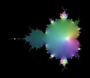 | Keywords: Mandelbrot-Iterate-15.jpg The diagram shows the part of the complex plane ranging from “2 2 to 1 on the real axis horizontal and from “1 4i to 1 4i on the imaginary axis vertical The color for a point <math>c</math> in the plane is the color coded value of the function <math>f \ n _c 0 \quad\text for n 15\quad\text and f_c z z 2+c</math> Note that the exponent refers to <math>f</math> as a function and not to its value i e <math>f</math> <math> n</math> denotes n-fold applying <math>f</math> <math>f \ n f\circ f\circ \cdots \circ f</math> So <math>f</math> <math> n</math> is an element of the sequence <math>\begin align f_c \ 0 z \ \; z \mapsto z\\ f_c \ 1 z \ \; z \mapsto z 2+c\\ f_c \ 2 z \ \; z \mapsto z 2+c 2+c\\ f_c \ 3 z \ \; z \mapsto z 2+c 2+c 2+c\\ \;\;\vdots \end align </math> For <math>n>0</math> the function <math>f_c n 0 </math> is a polynomial of degree <math>2 n-1 </math> in <math>c</math> Therefore it has <math>2 n-1 </math> zeros in the complex plane It turns out that all zeros are distinct Moreover the zeros are located in a disc around the origin whose diamater does not depend on <math>n</math> Das Diagramm zeigt einen Teil der komplexen Zahlen mit Realteil zwischen “2 2 to 1 horizontal und Imaginärteil zwischen “1 4i und 1 4i vertikal Die Farbe eines Punktes <math>c</math> der Ebene ist der farbcodierte Wert der Funktion <math>f \ n _c 0 \quad\text mit n 15\quad\text und f_c z z 2+c</math> Hierbei bezieht sich der Exponent auf <math>f</math> als Funktion und nicht auf deren Funktionswert d h <math>f</math> <math> n</math> steht fĂĽr die n-fache HintereinanderausfĂĽhrung von <math>f</math> <math>f \ n f\circ f\circ \cdots \circ f</math> Es ist <math>f</math> <math> n</math> also ein Glied der Folge <math>\begin align f_c \ 0 z \ \; z \mapsto z\\ f_c \ 1 z \ \; z \mapsto z 2+c\\ f_c \ 2 z \ \; z \mapsto z 2+c 2+c\\ f_c \ 3 z \ \; z \mapsto z 2+c 2+c 2+c\\ \;\;\vdots \end align </math> FĂĽr <math>n>0</math> ist die Funktion <math>f_c n 0 </math> ein Polynom vom Grade <math>2 n-1 </math> in <math>c</math> Somit hat die Funktion <math>2 n-1 </math> Nullstellen die alle verschieden sind Zudem liegen alle Nullstellen in einem Kreis dessen Größe unabhängig von <math>n</math> ist Self made using a throw-away C program 2008-03-24 Georg-Johann Lay Images of the sequence for n 1 20 0 cellpadding 1 cellspacing 1 - 110px thumb left 1 color map 110px thumb left 2 110px thumb left 3 110px thumb left 4 110px thumb left 5 - 110px thumb left 6 110px thumb left 7 110px thumb left 8 110px thumb left 9 110px thumb left 10 - 110px thumb left 11 110px thumb left 12 110px thumb left 13 110px thumb left 14 110px thumb left 15 - 110px thumb left 16 110px thumb left 17 110px thumb left 18 110px thumb left 19 110px thumb left 20 From step to step the number of zeros white is doubling The zeros are chaotically scattered around in a disc whose diameter does not depend on <math>n</math> For values of <math>c</math> that belong the the Mandelbrot set <math>M</math> the sequence <math>f 1_c 0 \; f 2_c 0 \; f 3_c 0 \ \ldots </math> is bounded For values not in <math>M</math> the sequence tends to infinity black Values of <math>c</math> located in the body of <math>M</math> ” the big cardioid ” lead to sequences that converge to a definite complex number In other words these values converge to a cycle of period 1 Values in the head of <math>M</math> ” the big circle at the left of the body ” tend to periodoc cycles of period 2 This can be seen in the sequence of images because the head changes its color from bright to dark and vice versa from step to step Values located in the small bulbs ” the hands symetrically arranged to the body ” tend to periodic cycles of period 3 and so on Von Schritt zu Schritt verdoppelt sich die Anzahl der Nullstellen weiĂź Die Nullstellen sind chaotisch verstreut in einem begrenzten Gebiet dessen Größe nicht von <math>n</math> abhängt FĂĽr Werte <math>c</math> in der Mandelbrot-Mengem <math>M</math> sind die Folgen <math>f 1_c 0 \; f 2_c 0 \; f 3_c 0 \ \ldots </math> beschränkt FĂĽr Werte ausserhalb von <math>M</math> streben die Folgen gegen Unendlich schwarz Werte im Körper von<math>M</math> ” dem Zykloid ” fĂĽhren zu konvergenten Folgen Mit anderen Worten die zugehörigen Folgewerte konvergieren gegen periodische Zykel der Länge 1 Werte im Kopf von <math>M</math> ” dem groĂźen Kreis links am Körper ” streben gegen periodische Zykel der Länge 2 Dies sieht man daran daĂź der Kopf mit jeden Bild seine Farbe von hell nach dunkel wechselt Werte in den Ă„rmchen ” den grösseren Kreisen links und rechts des Körpers ” fĂĽhren zu Folgen deren Grenzzyklen Periode 3 hat usw Coloring complex numbers To color a complex value the function described in <ref>Visualising complex functions</ref> is used with the parameters <math>\begin align a_s 0 6 \ b_s 0 5 \\ a_v 0 4 \ b_v 0 3 \\ \end align </math> and with S and V interchanged Zeros turn to white and infinity to black Zum Färben komplexer Zahlen verwende ich die Methode wie beschrieben in<sup>1</sup> mit den Parametern <math>\begin align a_s 0 6 \ b_s 0 5 \\ a_v 0 4 \ b_v 0 3 \\ \end align </math> und mit vertauschten Rollen von S und V Die Null wird zu WeiĂź und Unendlich zu Schwarz References <references/> Complex color plots of Mandelbrot iterations Order 15 |