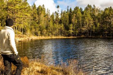 Keywords: mann innsjø skog lue natur norge tre vann våren sol stirrende alene frihet camping