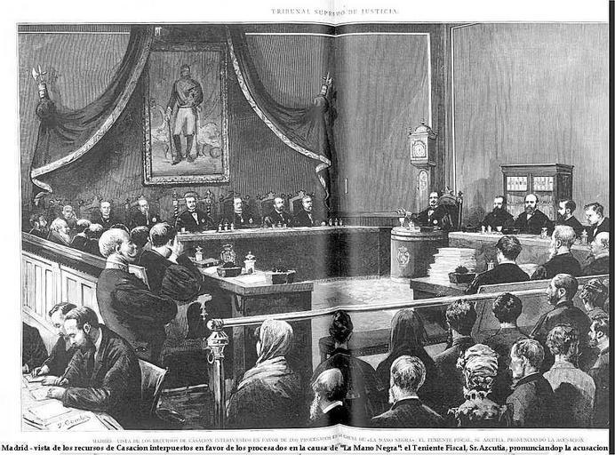 Keywords: Mano-negra-proceso-Blanco-de-Benaocaz-22-3-1884-sentencia-casacion.jpg it Madrid sentenza del 22 3 1884 della Cassazione nel processo per l'assassinio di Bartolomé Gago y Campos detto el Blanco de Benaocaz altrimenti noto come processo della Mano Negra - pubblico ministero Manuel Lopez de Azcutia - incisione di Juan Comba http //descargas cervantesvirtual com/servlet/SirveObras/01826630450169335210035/205560_008 pdf La Ilustración española y americana 30 3 1884 Año XXVIII Núm 12 Creator Juan Comba García 1884-03-30 Presidia el tribunal el Excmo Sr D Emilio Bravo presidente de la Sala segunda; ocupaban los sitiales de la derecha los excelentisimos Sres Boada inmediato al Sr Presidente Garcia Herraiz y Hervas y los de la izquierda los Excmos Sres Alcocer Aldecoa y Gallifa magistrados todos seis del Supremo; al lado de estos ante una mesa semicircular el teniente fiscal señor Azcutia; en un banco à la derecha del estrado tenian asiento los defensores de los procesados por este orden Sres Martinez Arsenjo Carvajal Hidalgo Saavedra Henestrosa Sidro Pedregal y Belda y en el banco de enfrente los Sres Maisonave Aguilera Diaz Merry y Ariño los cuales jureconsultos de merecida reputacion en el foro madrileno defendieron con elocuencia a sus patrocinados; en otro banco junto a la barra de separacion estaban los relatores ocupando el puesto central el senor Pantoja relator de los recursos y a su derecha el Sr Medina; en el lado opuesto se veian los taquigrafos y los rapresentantes de la prensa periodica y debemos hacer constar que el publico representado en el dibujo es reproduccion exacta del que en el acto de la vista ocupaba los escaños de la primeras filas y facil es reconocer entre las personas que le forman a cierto concurso asiduo a las vistas del Supremo Poco hemos de decir del acto publico que revistiò la solemnidad majestuosa exigida por lo grave e imponente del proceso; el teniente fiscal Sr Azcutia en discurso luminoso nutrido de buena doctrina correcto y pronunciado con energica entonacion combatiò el recurso interpuesto y solicitò que se casara y anulara la sentencia requerida pidiendo la imposicion de la ultima pena a los quince procesados PD-old 1884 in Spain 1884 in Madrid Lithographs by Juan Comba García La Ilustración Española y Americana Blanco de Benaocaz Manuel Lopez de Azcutia Spain in the 1880s 1884 La Ilustración Española y Americana |