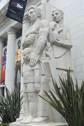 | Keywords: Man's Inventive Genius by Ralph Stackpole, granite, 1929-1932 - San Francisco Stock Exchange, 155 Sansome Street, San Francisco, CA - DSC04608.jpg en Man's Inventive Genius by Ralph Stackpole granite 1929-1932 - San Francisco Stock Exchange building 155 Sansome Street San Francisco California USA This work is in the public domain because it was published in the United States between 1923 and 1963 with its copyright not renewed Smithsonian Institution Control Number IAS CA001713 with the following summary Granite pylon carved with high-relief figure groups on three sides On the front is a full-length figure of a man He wears an undershirt and cuffed trousers He holds his proper right arm bent at the elbow against his chest In front of him stands a young boy The man's proper left hand rests on the boy's shoulder The boy wears a t-shirt and shorts His proper right arm is raised in a fist On the proper right side of the pylon is a full-length male figure His head is turned to the front of the pylon in proper right profile He wears a shirt and trousers and an apron around his waist He holds up a C-clamp in his proper right hand His proper left hand is clenched in a fist On the proper left side of the pylon is a full-length male figure His head is turned toward the front in proper left profile He wears a shirt and tie and lab coat In his proper left hand he cradles a lab beaker with a long spout Sitting in front of his proper right leg at elbow height is a small figure of a man atop a lightning bolt The man's knees are raised and his chin rests on his proper right arm Standing in front of the scientist at knee height is another full length male figure shown in proper right profile He wears a suit and is looking into a microscope The sculpture is mounted on a granite base 2015-05-23 13 52 41 own Daderot other versions PD-US-not renewed cc-zero Man's Inventive Genius by Ralph Stackpole |