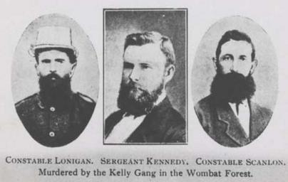 | Keywords: Mansfield police murdered by Kelly Gang.jpg en Portraits of Constable Lonigan Sergeant Kennedy Constable Scanlon murdered by the Kelly gang in the Wombat forest 1878 photograph b w ; 12 0 x 16 5 cm 1878 http //nla gov au/nla pic-vn3796087 author other versions PD-old-70-1923 Uncategorized 2015 October 26 Uploaded with UploadWizard |