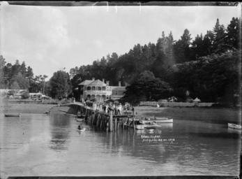 | Keywords: blackandwhite monochrome outdoor watercourse water lake landscape riverbank black and white Mansion House and nearby buildings, Mansion House Bay, Kawau Island, taken from off shore. Mansion House was possibly a guest house at this time. A group of people are waiting on the wharf for the ferry. Photograph taken by William A Price, early 1900s. Inscriptions: Inscribed - Photographer's title on negative -bottom centre: Kawau Island Auckland NZ No 1878. Quantity: 1 b&w original negative(s). Physical Description: Dry plate glass negative 4.5 x 6.5 inches Mansion House, Kawau Island from the water. Price, William Archer, 1866-1948 :Collection of post card negatives. Ref: 1/2-000249-G. Alexander Turnbull Library, Wellington, New Zealand. natlib.govt.nz/records/22536592 Mansion House and nearby buildings, Mansion House Bay, Kawau Island, taken from off shore. Mansion House was possibly a guest house at this time. A group of people are waiting on the wharf for the ferry. Photograph taken by William A Price, early 1900s. Inscriptions: Inscribed - Photographer's title on negative -bottom centre: Kawau Island Auckland NZ No 1878. Quantity: 1 b&w original negative(s). Physical Description: Dry plate glass negative 4.5 x 6.5 inches Mansion House, Kawau Island from the water. Price, William Archer, 1866-1948 :Collection of post card negatives. Ref: 1/2-000249-G. Alexander Turnbull Library, Wellington, New Zealand. natlib.govt.nz/records/22536592 |