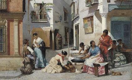 | Keywords: Manuel Wssel de Guimbarda Vendedoras de rosquillas en Sevilla - ca. 1880.jpg es Vendedoras de rosquillas en una calle de Sevilla en Rosquilla Sellers in a Corner of Seville Oil on canvas 107 x 81 cm Inv CTB 1987 29 Institution Museo Carmen Thyssen http //www carmenthyssenmalaga org/en/obra/168 Creator Manuel Ussel de Guimbarda 1881 http //sevillaciudad sevilla abc es/reportajes/casco-antiguo/cultura-casco-antiguo/un-viaje-todo-color-por-la-sevilla-costumbrista/ PD-old-100 Paintings by Manuel Ussel de Guimbarda Paintings in the Museo Carmen Thyssen Málaga Street vendors in art 19th-century painters from Spain 1881 in Spain Paintings of Seville Manila shawls Pottery in Spanish painting |