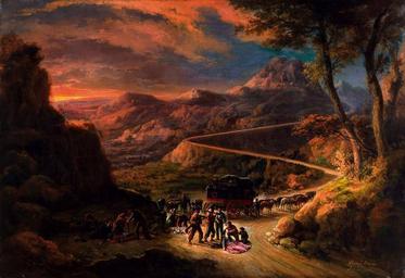 Keywords: manuel y carrillo painting art artistic artistry oil on canvas landscape sky clouds nature outside country countryside trees scenic sunset people holdup robbery stagecoach mountains