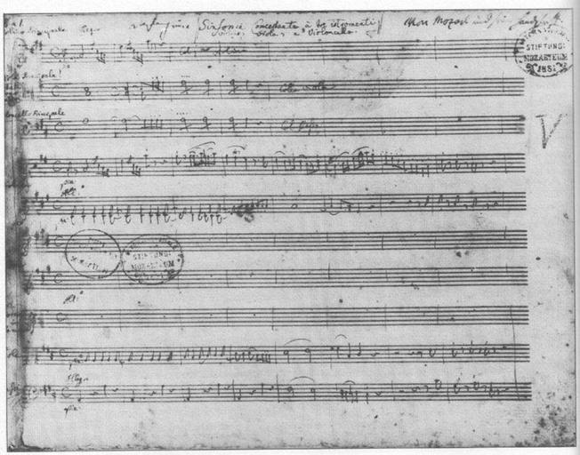 Keywords: Manuscript kv364.jpg Original manuscript page of Mozart's Sinfonia concertante K V Anh 104 3230e Sinfonia concertante in A für Violine Viola Violoncello und Orchester K Anh 104 320e Sheet music of Wolfgang Amadeus Mozart PD-old