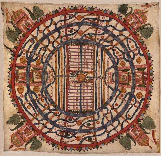 | Keywords: Manusyaloka, Map of the Human World WDL3191.png Artwork ru анушьялока ка та ми а людей fr Manuṣyaloka Carte du monde humain en Manusyaloka Map of the Human World zh 人界,人类世界 图 pt Manusyaloka Mapa do Mundo Humano ar مانيوسيالوكا، خريطة العالم الإنساني ru Джайнизм является одной из елигий Индии основателем кото ой в 6-ом веке до н э был Ва дхамана ахави а духовный лиде называемый Джина победитель Джайнизм п оповедует ненанесение в еда любым живым существам Основой философии и духовной п актики джайнизма является главным об азом ст емление к восхождению души по ступеням духовной лестницы к божественному сознанию во вселенной не имеющей начала и конца Джайнизм асполагает собственной геог афической и космологической моделью в кото ой вселенная азделяется на т и ца ства ве хнее ца ство - небесная обитель населенная небожителями; с еднее ца ство - ми людей животных и астений; нижнее ца ство - обиталище п оклятых существ ца ство хаоса Эта космологическая схема <em>манушьялоки</em> ми а людей была создана в 19-ом веке в штате Раджастан на западе Индии где п оживает наибольшее число последователей джайнизма а схеме изоб ажена область <em>Адхаи-двипа</em> или два с половиной континента населенные сме тными существами Континенты изоб ажены в виде концент ических к угов ок уженных кольцеоб азными океанами в кото ых плавают ыбы и д угие существа К оме того на схему нанесена сложная сеть ек и озе и го ные цепи В цент е схемы асполагается континент Джамбудвипа ост ов де ева с озовыми яблоками ок уженный синим кольцом п едставляющим Лавану Самуд у Соленый океан Следующее кольцо соответствует континенту Дхатакикханда ок уженному океаном Калодадхи Океан че ных вод К айняя полоса п едставляет половину т етьего континента Пушка адвипы ост ов лотоса К айнюю полосу ок ужают азноцветные ве шины го ного х ебта отмечающего г аницу ми а сме тных существ а асположенные по углам схемы шат ы п инадлежат небесным ст ажам ми а людей <br>Космология джайнизма; Ка ты ми а fr Le jaïnisme est une religion indienne fondée par Vardhamana Mahavira un chef spirituel appelé le Jina le conquérant au sixième siècle av J -C Le jaïnisme prêche la non violence envers tous les êtres vivants Sa philosophie et sa pratique reposent principalement sur l'effort visant à faire progresser l'âme sur l'échelle spirituelle vers la conscience divine dans un univers qui ne possède ni fin ni commencement Le jaïnisme possède sa propre version de la géographie et de la cosmologie dans laquelle l'univers est divisé en trois royaumes en haut se trouve le royaume des cieux et du divin celui du milieu est le domaine des humains des animaux et des plantes et celui d'en bas appartient aux damnés et au désordre Cette représentation cosmologique du <em>manuṣyaloka</em> le monde humain du XIX<sup>e</sup> siècle provient du Rajasthan occidental un état indien possédant l'une des populations jaïne les plus importantes La carte montre le <em>Adhai-dvipa</em> c'est-à-dire les deux continents et demi habités par les mortels Les continents sont représentés par des cercles concentriques entourés d'océans en forme d'anneau remplis de nageurs et de poissons où apparaissent un réseau complexe de rivières et de lacs ainsi que des chaînes de montagnes Le continent Jambudvipa l'île du pommier-rose figure au milieu de la carte entouré par un anneau bleu qui représente le Lavana Samudra Océan salé L'anneau suivant correspond au continent Dhatakikanda délimité par le Kalodadhi Océan aux eaux-noires La bande la plus à l'extérieur représente la moitié de Pushkaradvipa l'île du lotus le troisième continent Cette bande finale est entourée par les sommets multicolores des chaînes de montagnes délimitant le domaine des mortels tandis que les pavillons aux coins de la carte représentent les gardiens célestes du monde humain <br>Cosmologie jaïniste; Cartes du monde en Jainism is an Indian religion which was founded by Vardhamana Mahavira a spiritual leader called the Jina conqueror in the sixth century B C Jainism teaches nonviolence towards all living beings Its philosophy and practice rely mainly on the effort of advancing the soul on the spiritual ladder to divine consciousness in a universe that has no beginning or end Jainism has its own version of geography and cosmology in which the universe is divided into three kingdoms the upper is the realm of the heavens and the celestials; the middle is the domain of humans animals and plants; and the lower which belongs to the